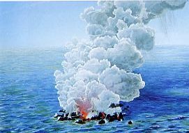 One of the first islands to form on the Earth. The picture shows a bright sunny day, but the atmosphere is likely to have been dark and smoggy. (Painting by Bill Hartmann.)